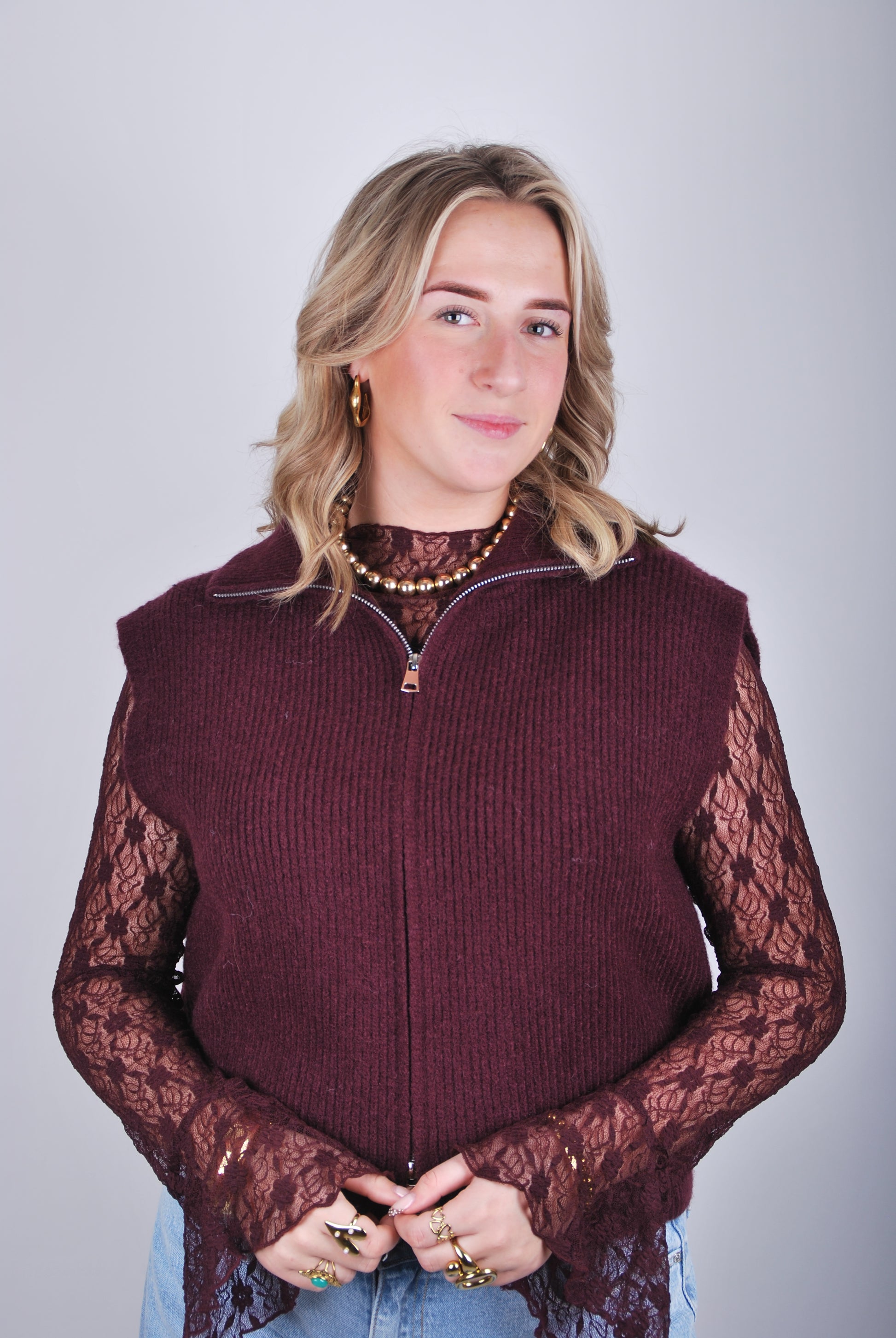Dit bordeaux gilet is een ideaal laagje voor elke dag. We hebben ’m gecombineerd met onze kanten Fara top, maar je kunt ’m eigenlijk overal overheen dragen — van een basic tee tot een blouse. Een makkelijk vestje dat elke outfit net wat warmer en stijlvoller maakt.