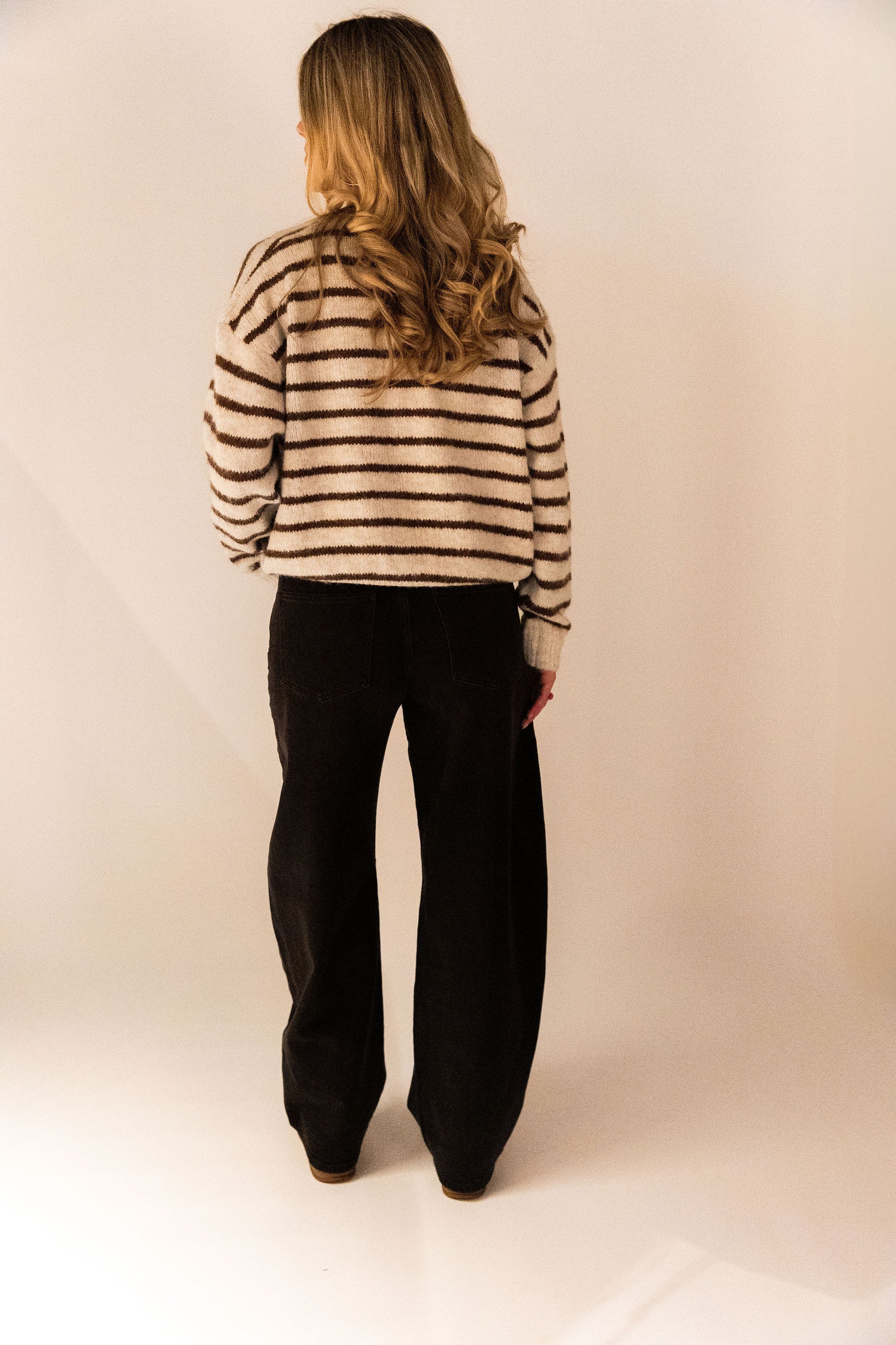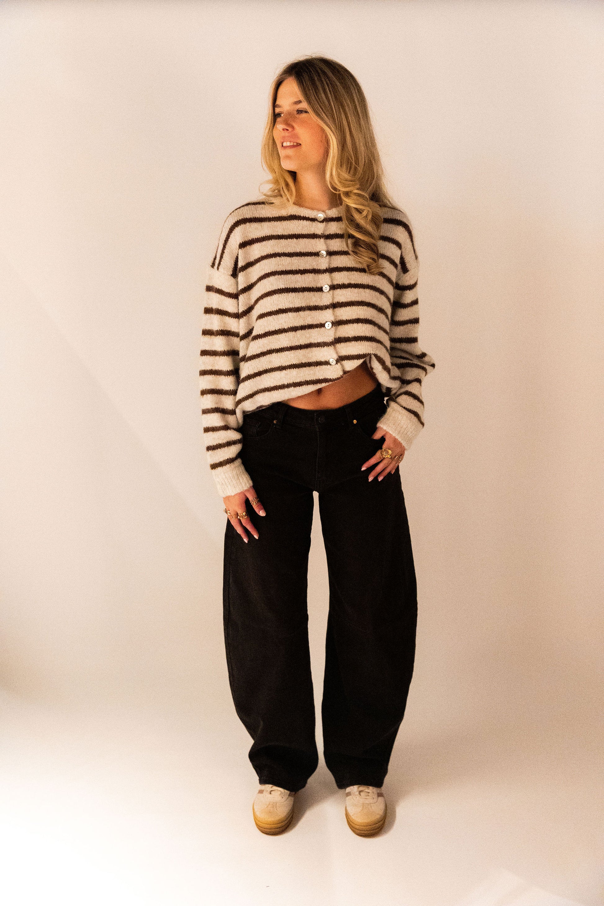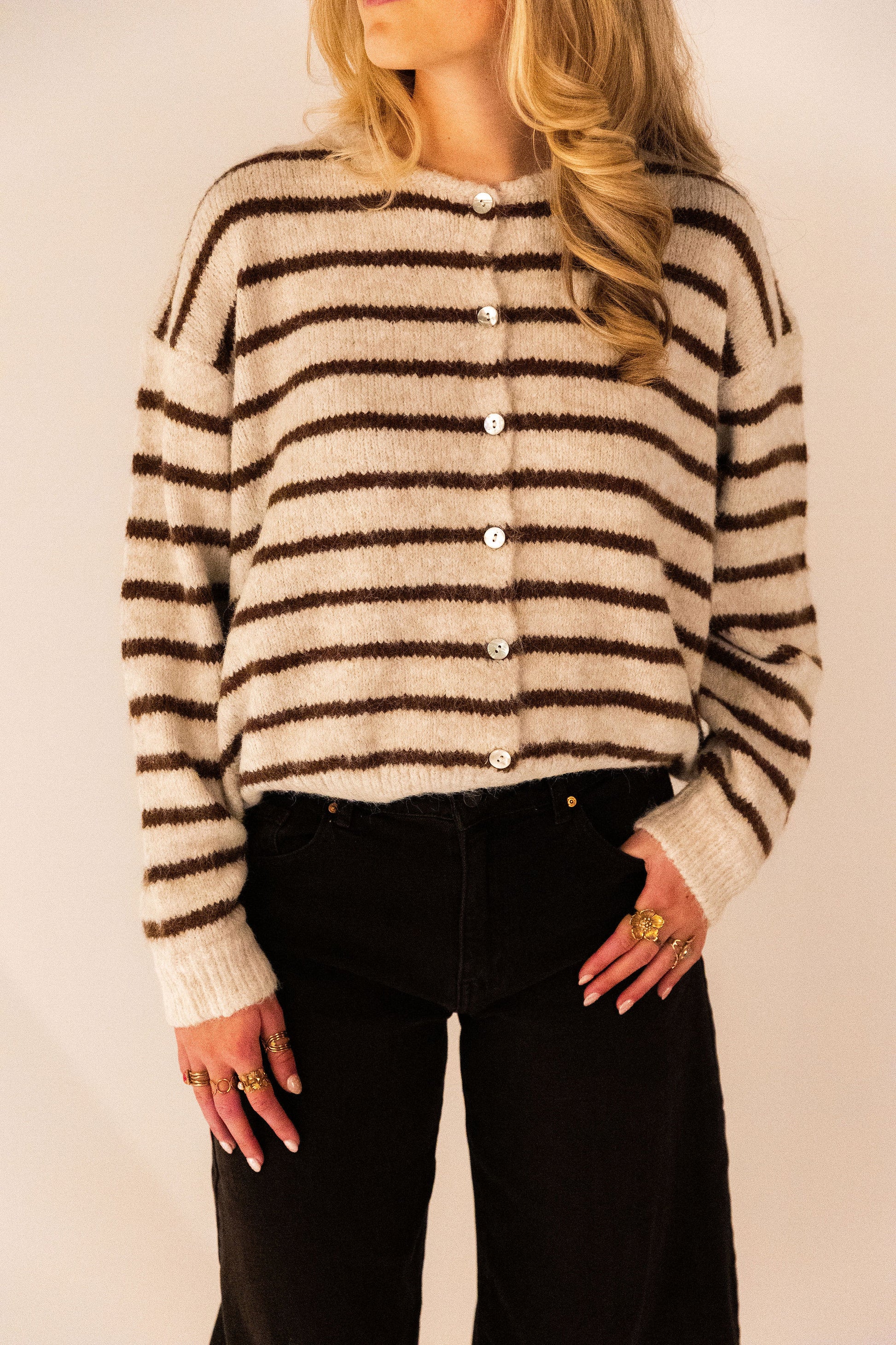 Dit vest is precies wat je nodig hebt voor de koudere dagen. De zachte, warme stof voelt heerlijk comfortabel aan, terwijl de ecru kleur met bruine strepen zorgt voor een frisse, trendy uitstraling.