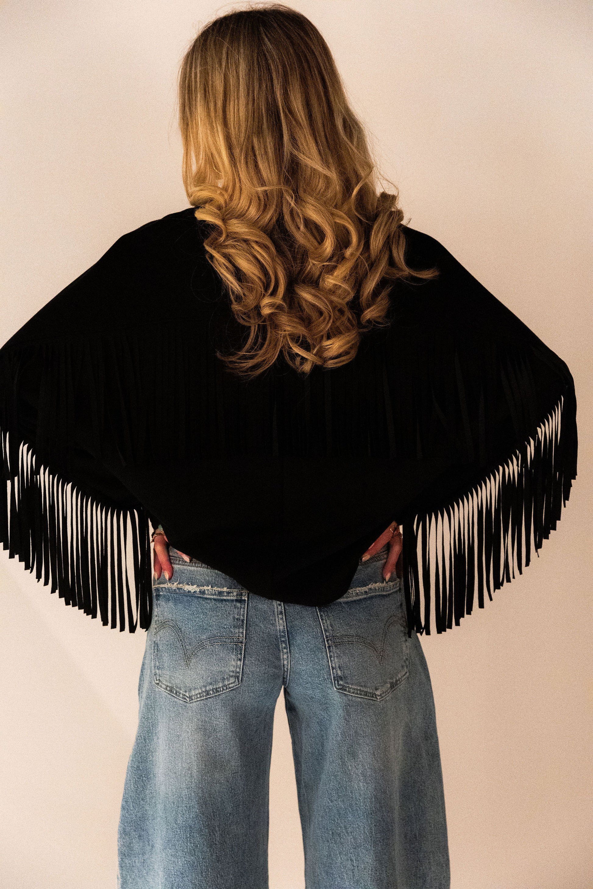 Deze zwarte sweater met franjes is dé perfecte mix van comfort en statement. De zachte stof zit heerlijk, terwijl de franjes aan achterkant zorgen voor een trendy, speelse touch die elke outfit naar een hoger niveau tilt.