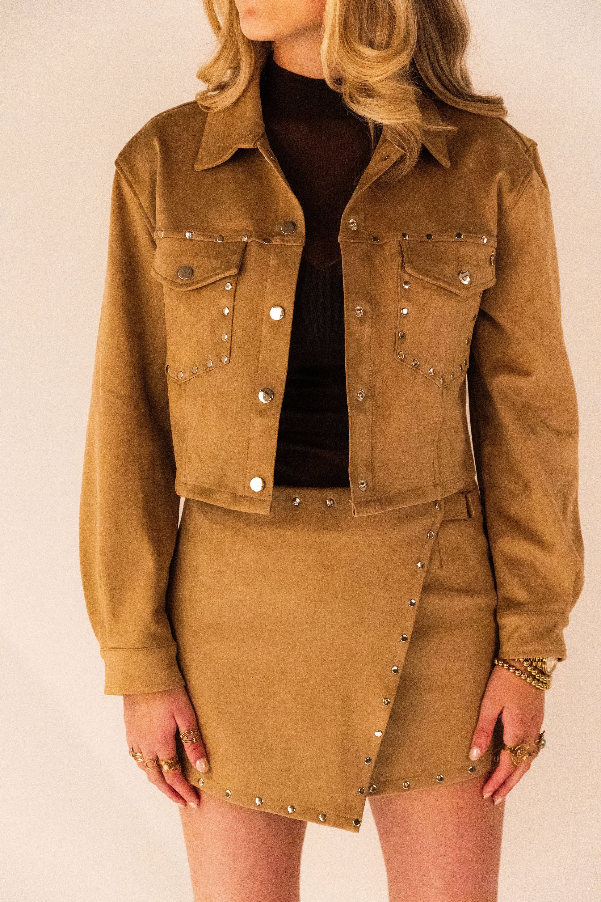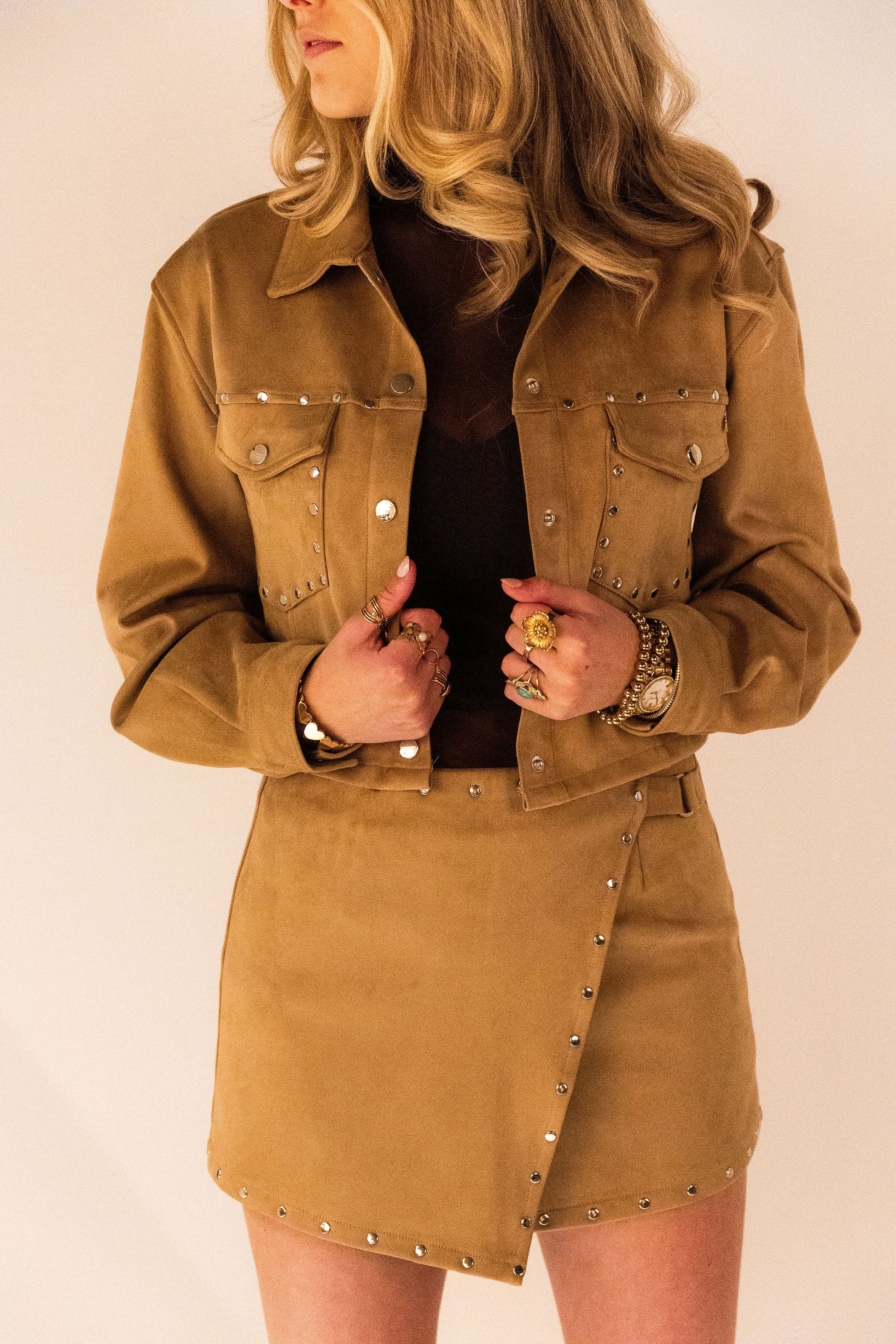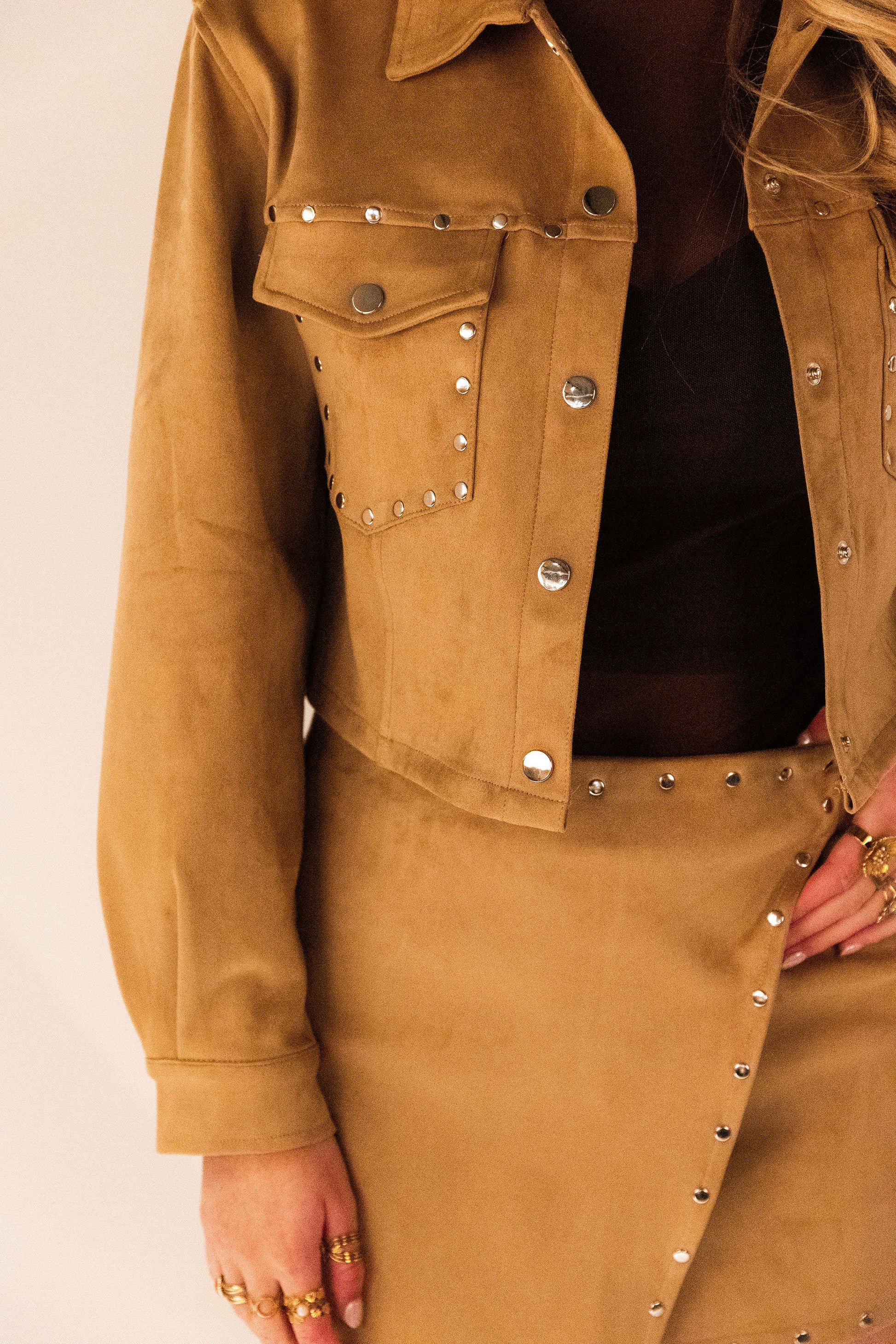 Voeg een vleugje luxe toe aan je garderobe met dit zachte suède jasje. Draag het los voor een subtiele, chique look, of combineer met het bijpassende skortje voor een complete, stijlvolle outfit die perfect is voor elke gelegenheid.