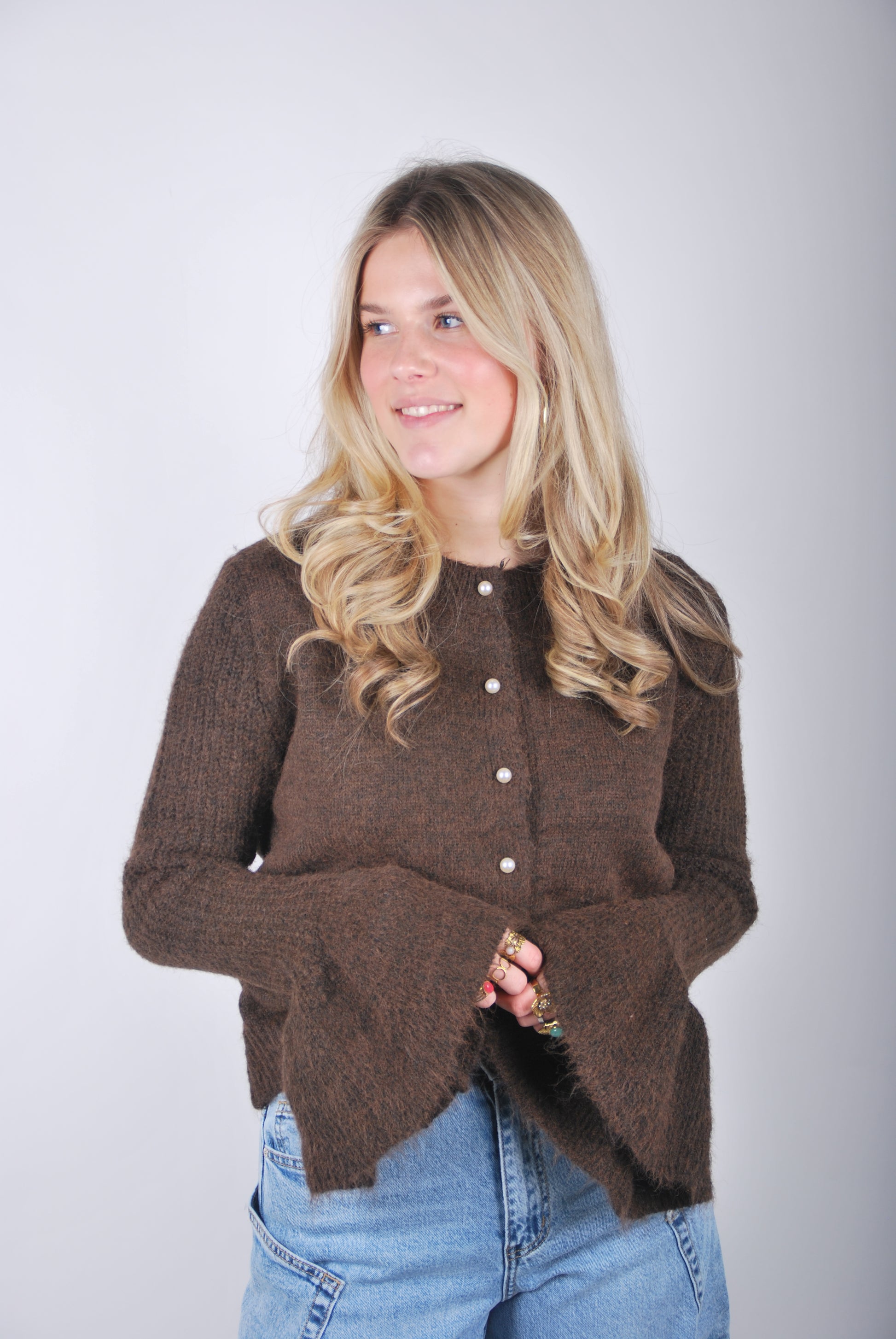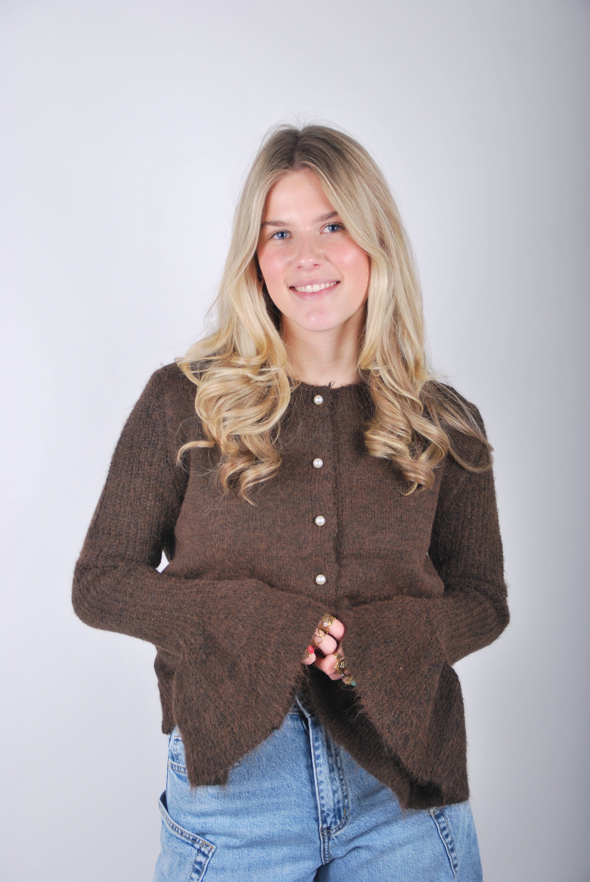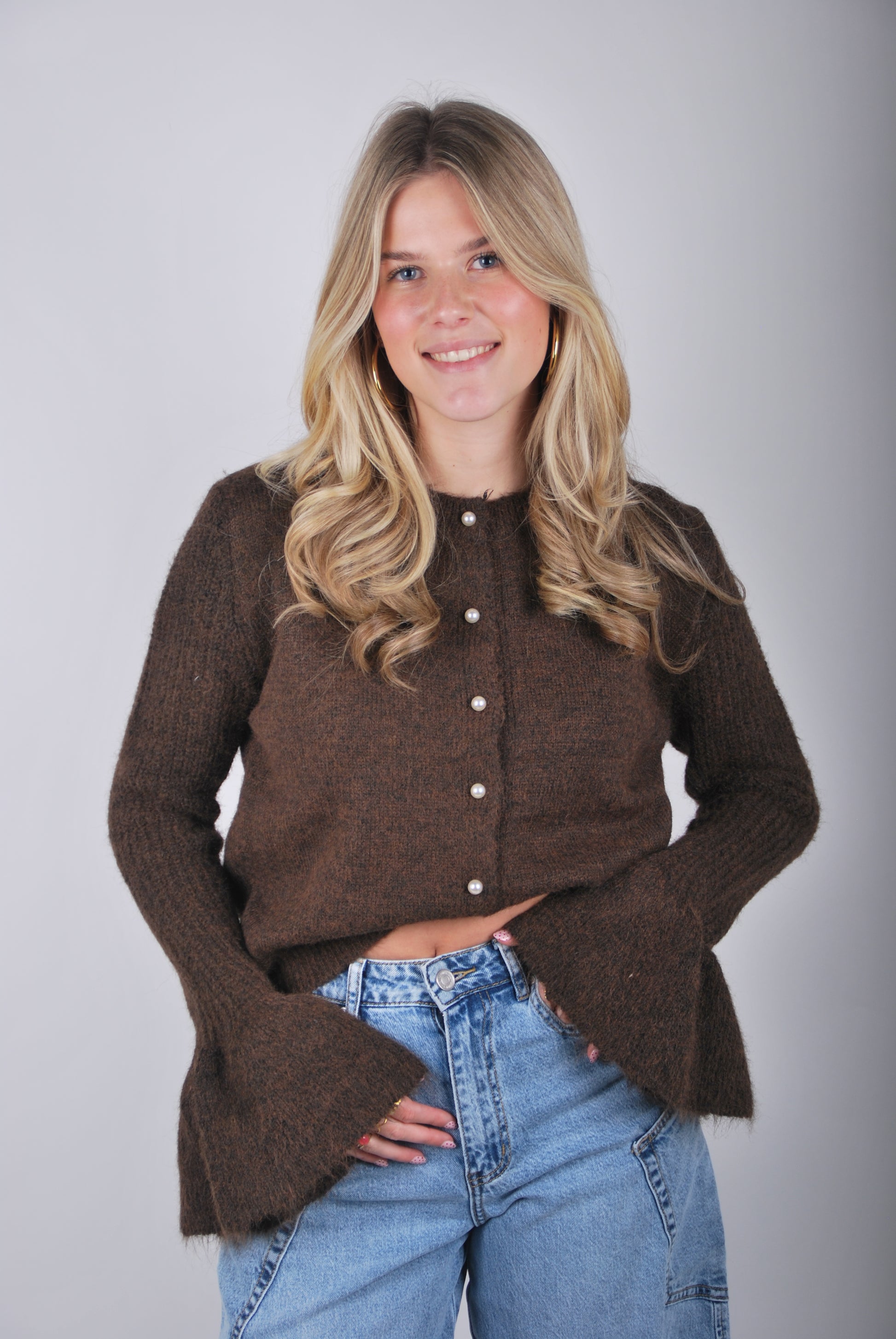 Geef je look een stijlvolle upgrade met dit elegante bruine vestje. Het uitlopende mouwtje zorgt voor een verfijnde, vrouwelijke uitstraling, terwijl de parelknoopjes een chique detail toevoegen.