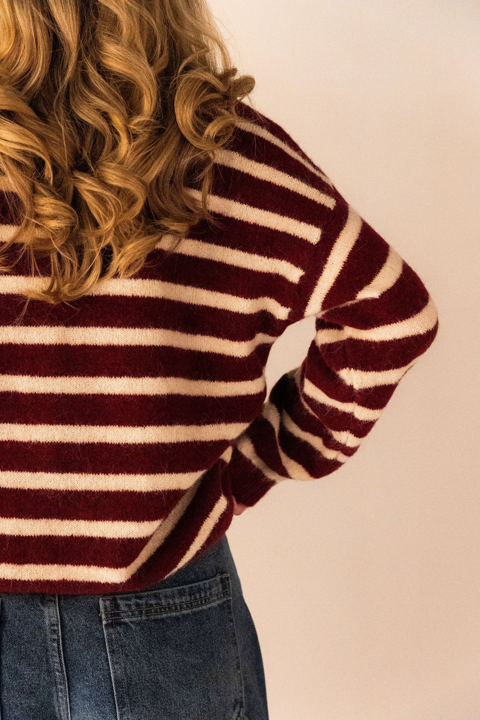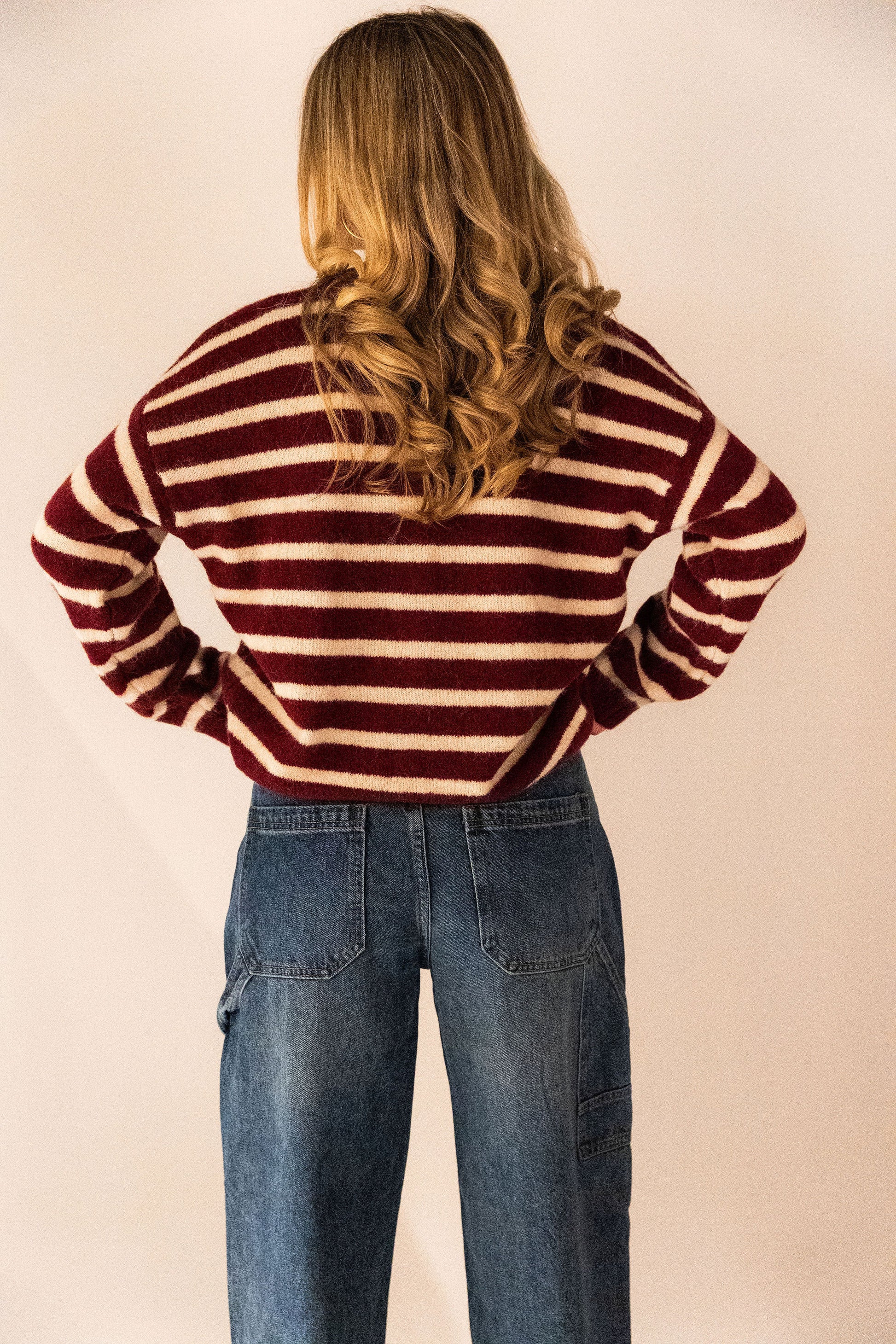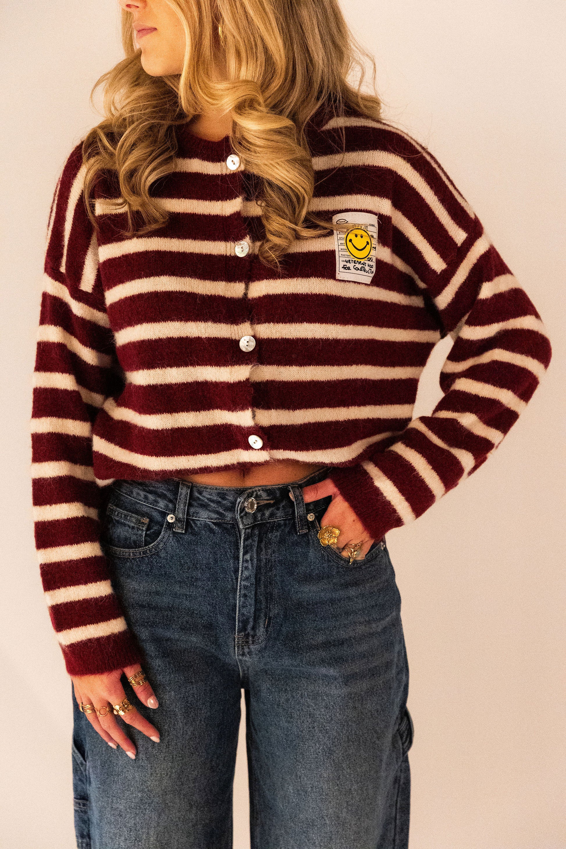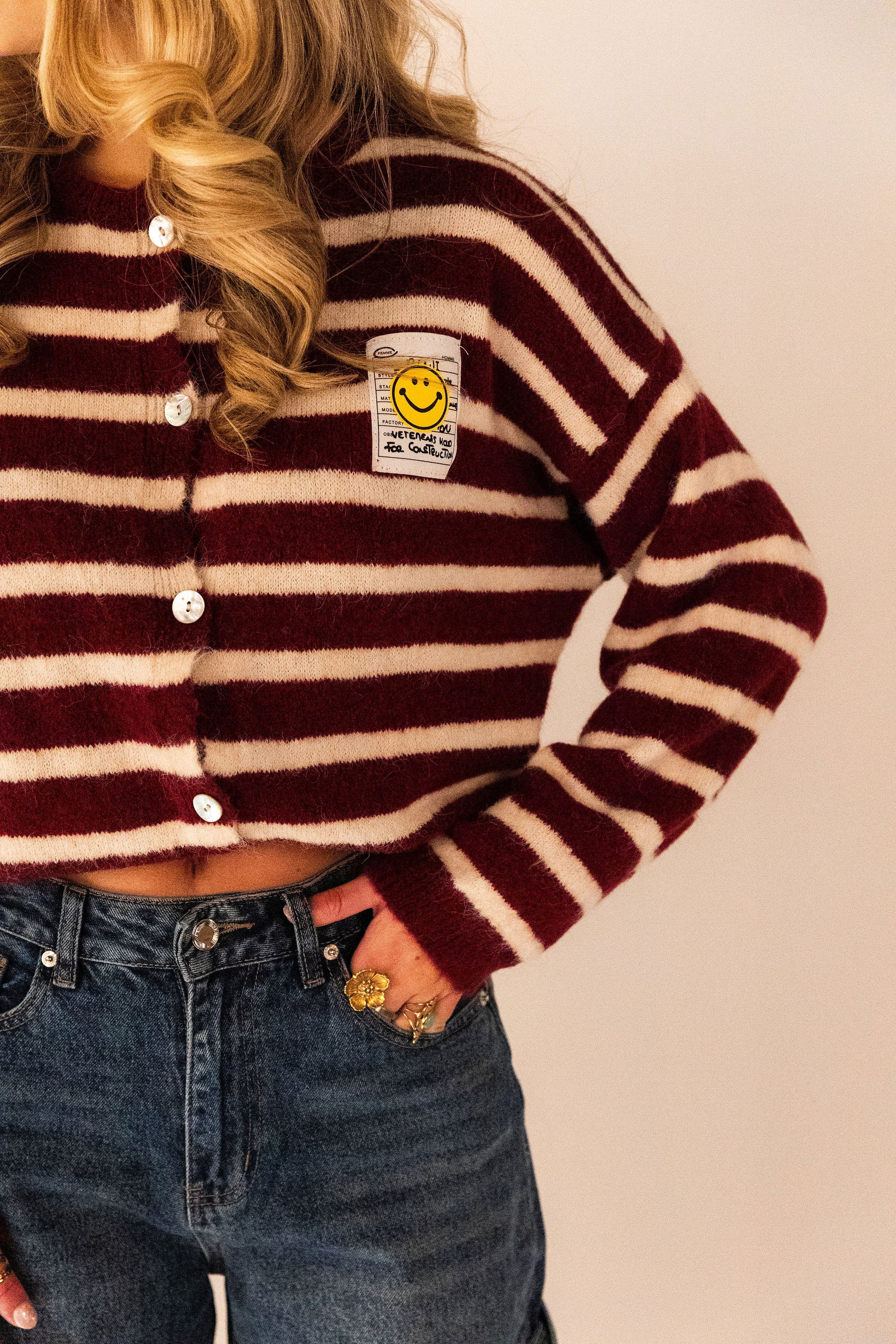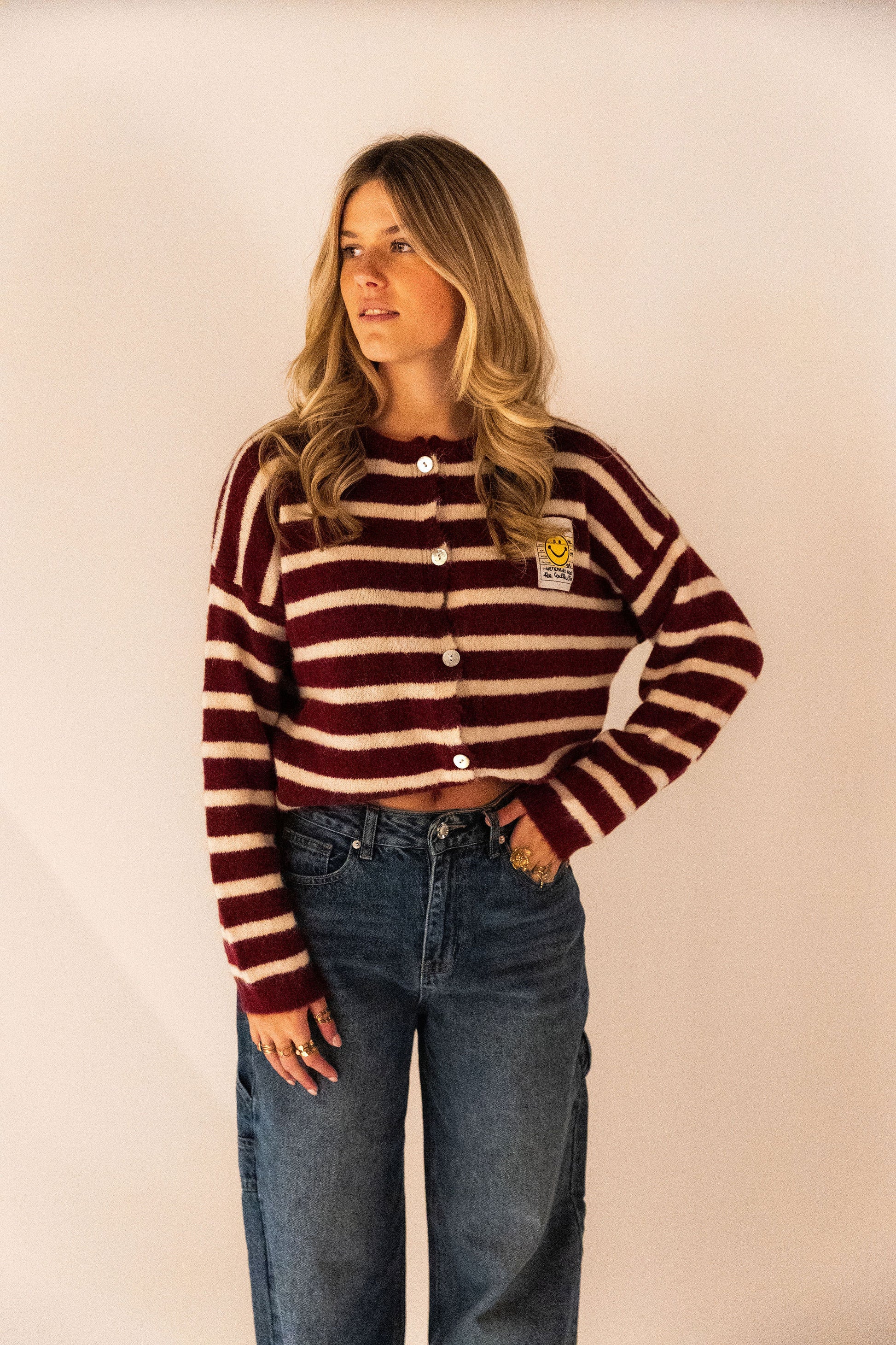 Dit bordeaux gestreepte vestje is een echte eyecatcher! Het zachte, comfortabele materiaal maakt ’m heerlijk om te dragen, en het speelse smiley-detail geeft je outfit direct een vrolijke twist. Perfect om casual te stylen of te combineren met je favoriete jeans voor een trendy, relaxte look.