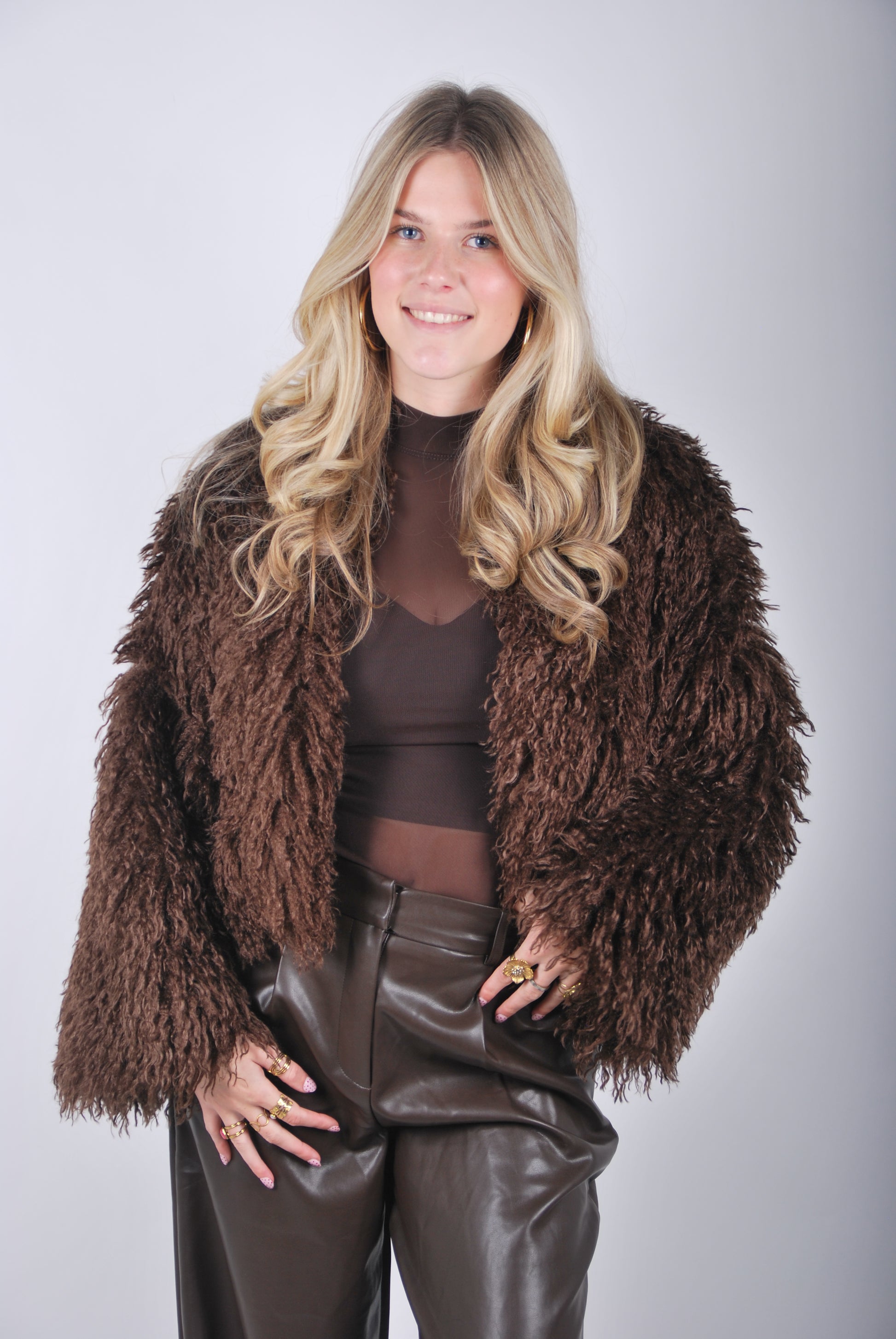 Deze bruine teddy jas is een fijne toevoeging aan je garderobe. Het zachte materiaal zorgt voor een comfortabele pasvorm en houdt je warm op koudere dagen. Door het korte model is de jas makkelijk te combineren met verschillende outfits.